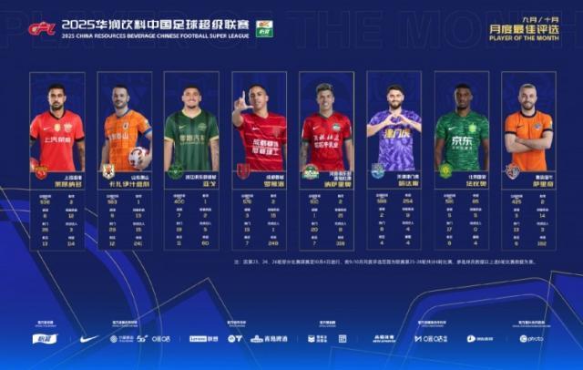 11月18日,中超官方公布了2025赛季中超联赛月最佳球员(9/10月)评选,莱昂纳多、法比奥等8名球员入围候选。