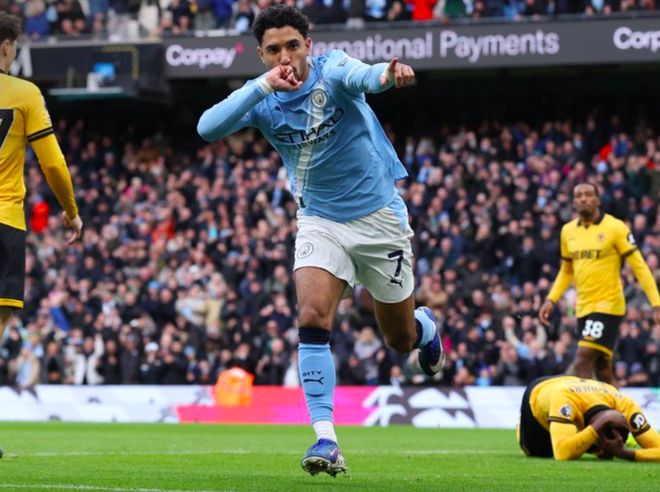 开场之后,曼城就大举压上,开启了传控的压迫性打法,狼队防守有些顾此失彼。第6分钟,努内斯边路没有任何调整,直接传球,狼队中卫准备头球解围,被马尔穆什抢先一脚,将球打进。