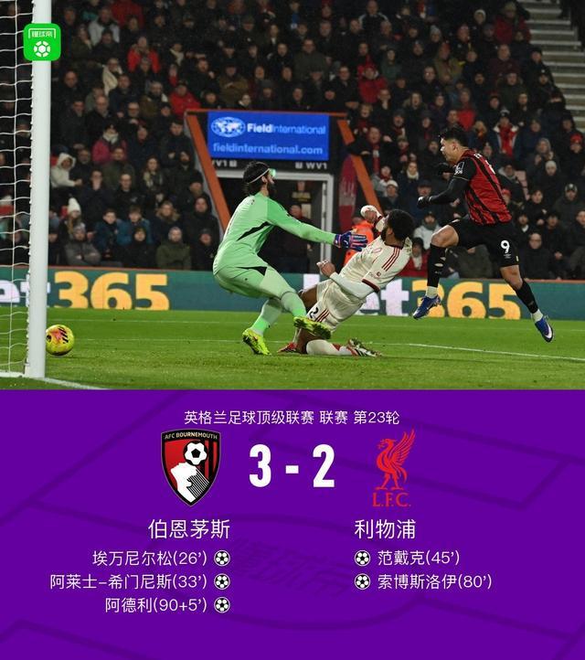 第90+5分钟,补时绝杀!阿德利门前小角度挑射入网,伯恩茅斯3-2利物浦